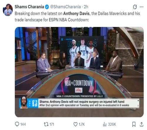 北京时间1月15日,ESPN的一档播客节目,Shams透露独行侠已经降低了对戴维斯的交易期待,独行侠已经决定不急于做出决定,因为戴维斯面临合同到期可以今夏再处理,也可以留下他等他伤病好转,管理层认为他在三月就能复出。今夏用他换几个选秀权也可以,留着他、欧文继续帮助弗拉格也行。