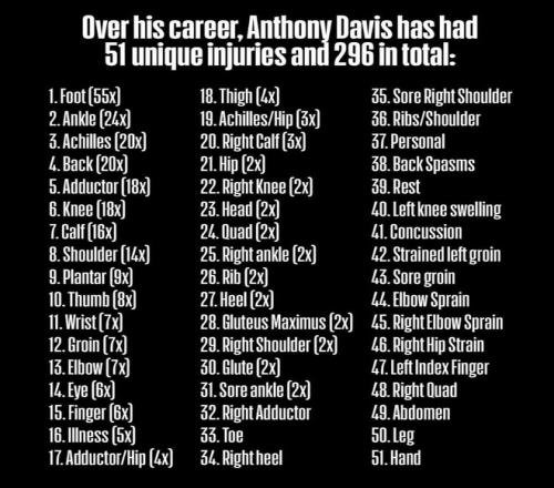 根据美媒的统计,安东尼-戴维斯自进入联盟起他就是一个玻璃人,生涯14个赛季已经遭遇了296次伤病其中还有51次非常特殊的伤病。(脚部的伤病有55次太逆天)