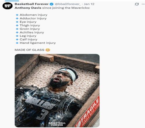 自2025年二月交易截止日浓眉加入独行侠后,他先后遭遇腹部损伤、内收肌损伤、眼部损伤、大腿损伤、腹股沟损伤、跟腱损伤、腿部损伤、小腿损伤、手部韧带损伤等大大小小的伤病,这也是各队就算交易得到他也无法直接跟他提前续约的关键所在。