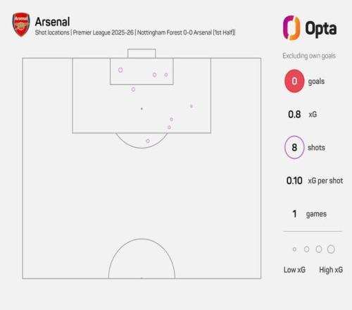 此役客场对阵诺丁汉森林,阿森纳在上半场共有8次射门,这是他们自2019年12月阿尔特塔执教枪手首战、对阵伯恩茅斯(当时上半场9次射门)以来,阿森纳在英超射门次数最多却没有一次射正的上半场比赛。