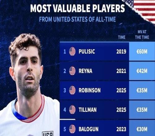 北京时间11月16日,德转列出了美国球员历史身价排名前10的球员,2019年身价曾经达到6000万欧元的普利希奇高居第一,吉奥瓦尼-雷纳4200万欧元第二,安东尼-罗宾逊和马利克-蒂尔曼同